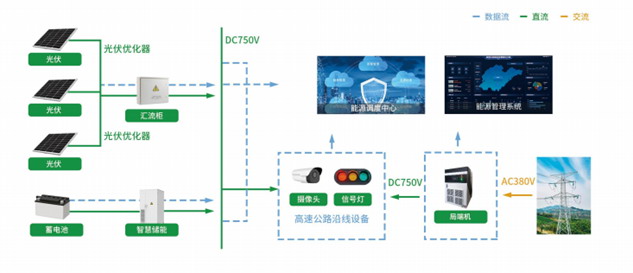 高速公路沿線設(shè)備直流供電通過(guò)建設(shè)路側(cè)分布式綠色能源站,就地接入就地消納,提高綠色能源占比,減少電力遠(yuǎn)傳,進(jìn)一步降低系統(tǒng)損耗。